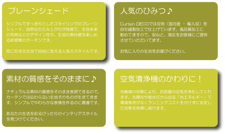 | “Curtain DECO”は、Romon Shade (シェードカーテン) などのカーテンには消臭や汚れ防止のために 光触媒を塗布して御渡ししています。 ![]() (詳しくは、チタンガード21 webサイトへ) |